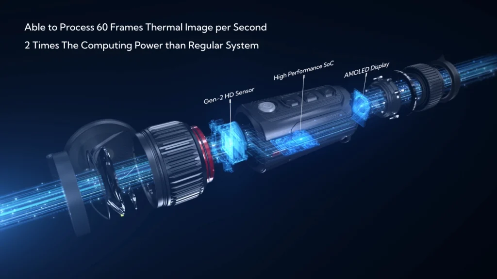 From 17 µm to 12 µm, 8 µm, and now 6 µm sensors, our push for smaller pixel sizes means more compact gear with greater detection ranges. Beyond sensors, we design advanced chip systems — such as the VISTA S50R’s CoS (Chip on System) — delivering computing power twice that of standard chips, capable of processing 60 frames of 1280-resolution thermal images per second. For hunters, this means smoother, more fluid imaging — especially when tracking fast-moving game.